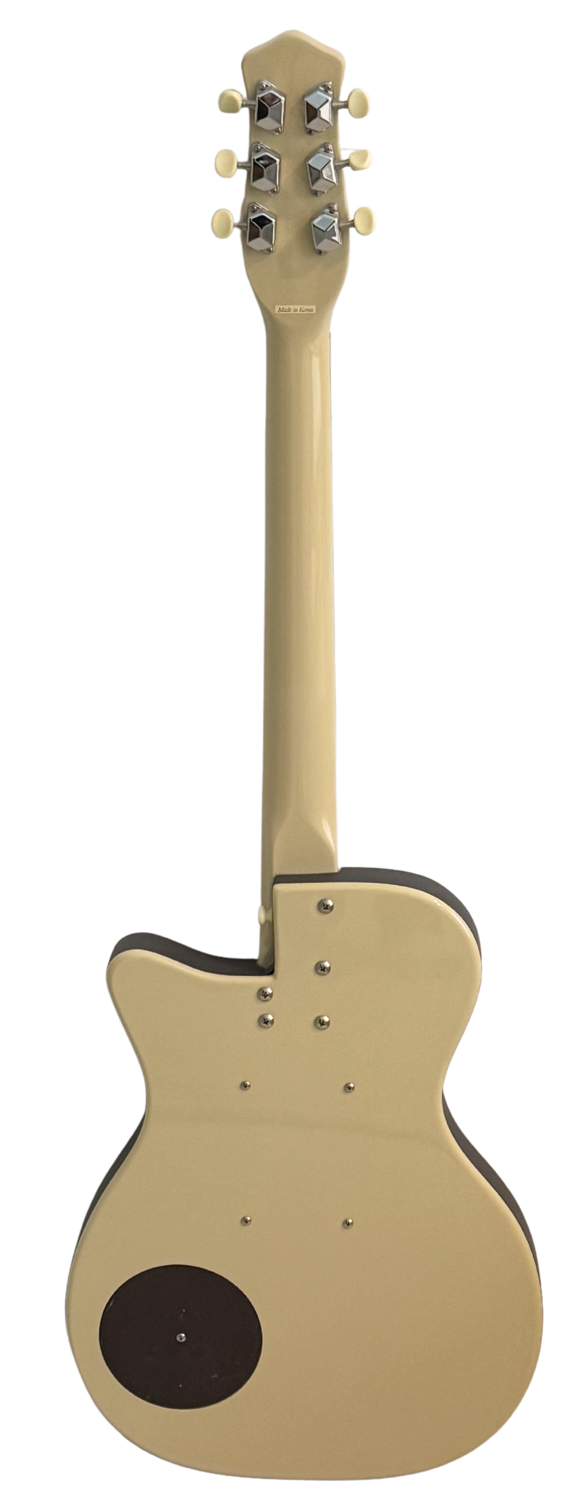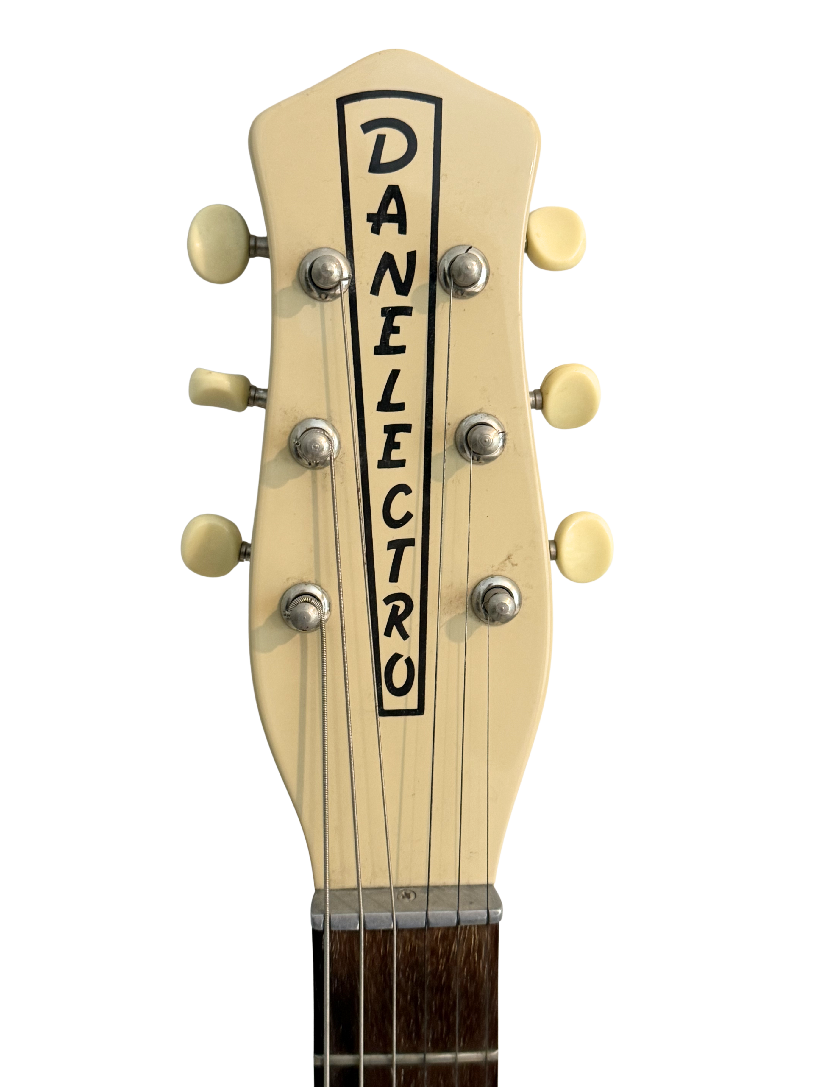 This Danelectro was made in Korea in 1998 and is a reissue of their 1956 U-2 model. The single cutaway body is semi-hollow which makes it nice and light. It has a poplar frame with a masonite top and back. The neck is made of maple, has a C shape and is bolted onto the body. Fingerboards on these 90’s MIK ones were made of Rosewood. They use Pau Ferro now. Scale length is 25”. The neck has a 14” flat radius with 21 frets. Two lipstick pickups, a 3-way pickup selector, one volume and one tone control that is stacked and an adjustable wrap-around bridge with rosewood saddle. The finish is called Malt Shop Cream and it’s just perfect for this guitar. The “tolex like” tape that runs along the outside of the body (another Danelectro signature design) is a chocolate brown color.