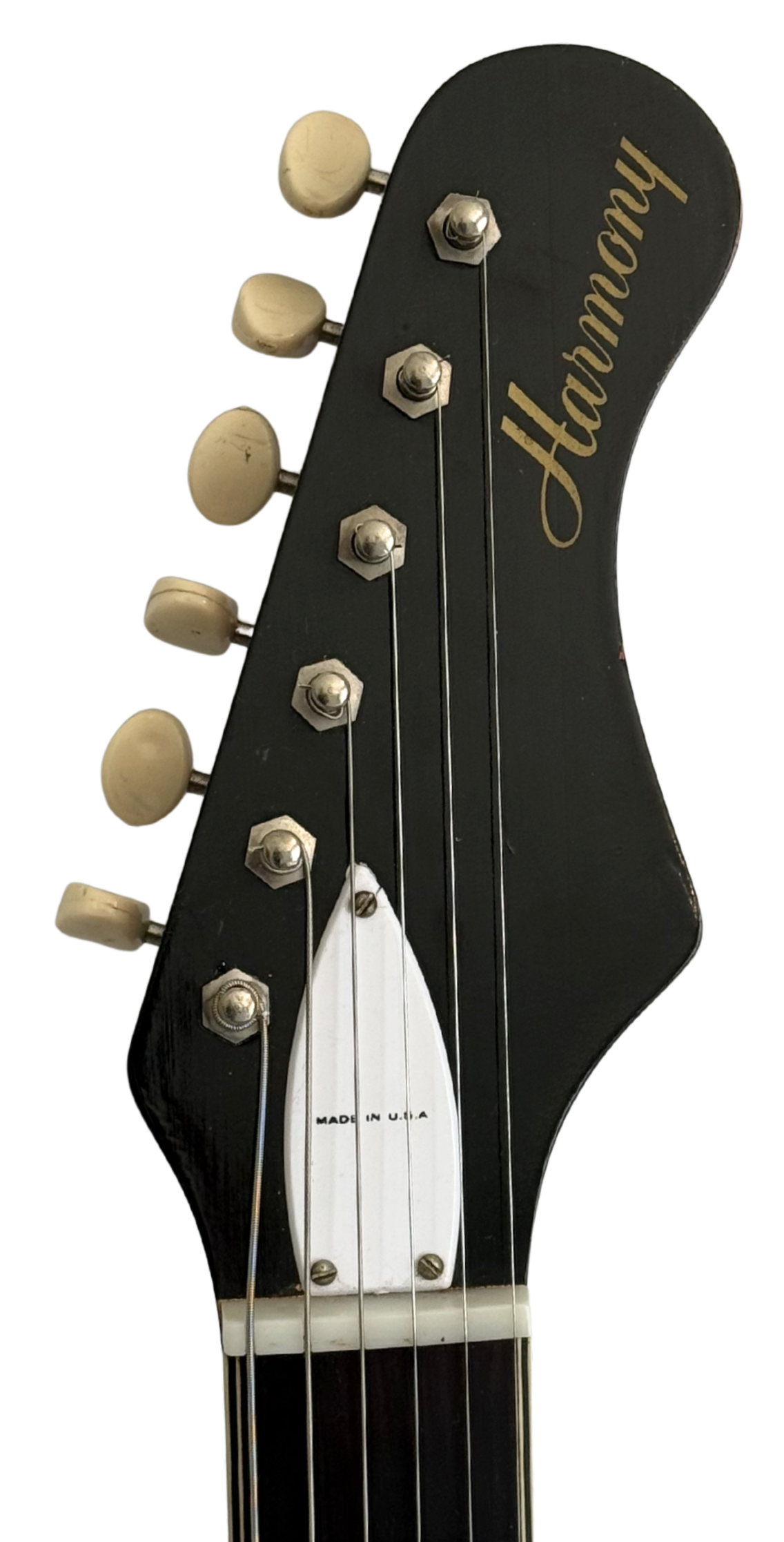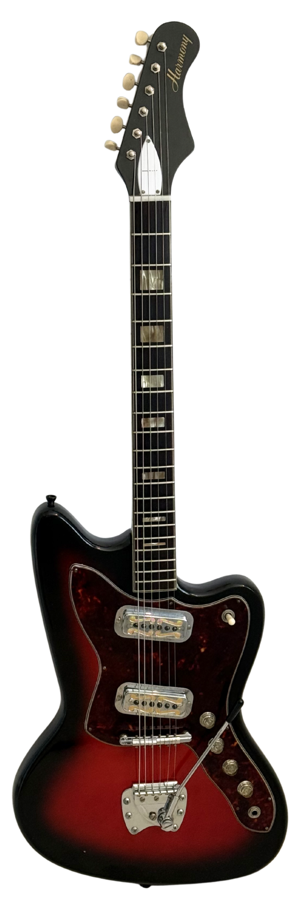 Harmony was clearly going after the double cutaway, solid body Stratocaster design which was hugely popular at the time. It has 6 in-line tuners and a floating vibrato. The neck and body are pretty good. These guitars were sold at about half the price of a Stratocaster. Harmony had to cut some corners and used scaled manufacturing efforts to made a good product for that lower price. It doesn’t feel as refined as a Strat. The vibrato is often referred to as a “Hagstrom Trem”, a design first popularized in the 60’s by the Swedish made Hagstrom guitars. It’s more of a vibrato than a tremolo and the tuning stability isn’t quite the same as a Strat.