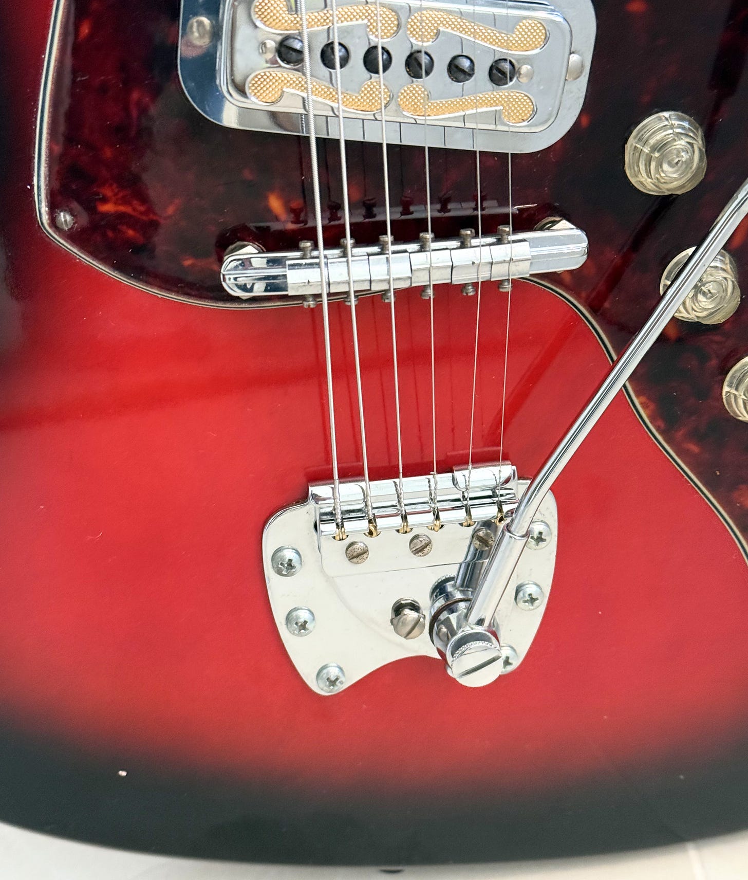 While it is definitely an enjoyable guitar to play, if you haven’t played a vintage budget electric like this you might notice it feels rougher compared to a modern electric. This is mainly due to design. Neck angle, headstock angle, limited bridge design. The action can be a higher on them sometimes. A good setup performed by a professional can help to some degree.