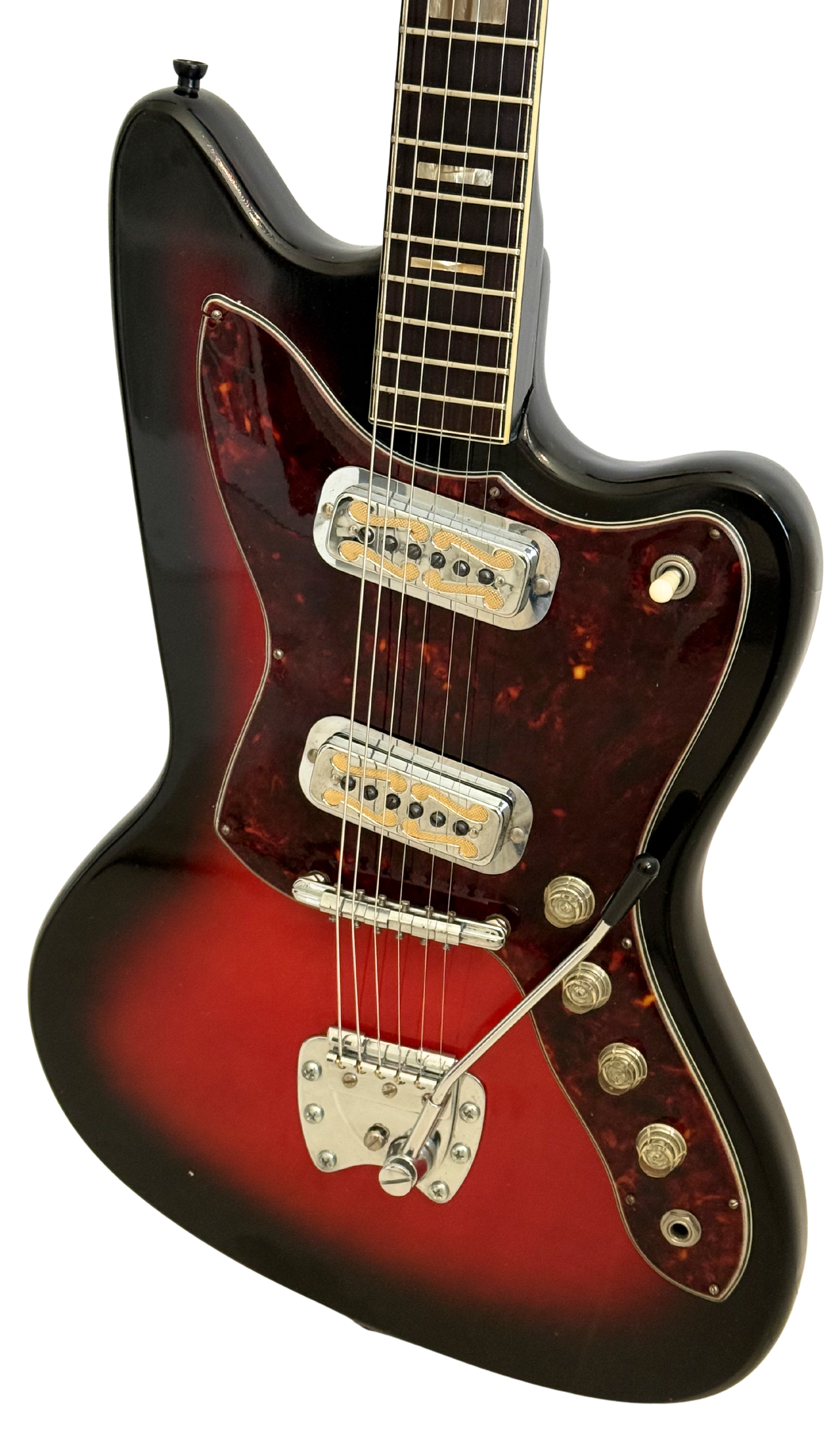 From surf or blues to garage rock and punk this guitar has a unique vibe that’s all its own. The red burst finish and tortoise shell pickguard scream 60’s. This guitar is as warm as it gets. There’s nothing sterile feeling or sounding about these. Even the original case is funky with its shape that’s molded to the body contours of the guitar and red plush interior that looks like something out of my neighbors van in the 70’s.